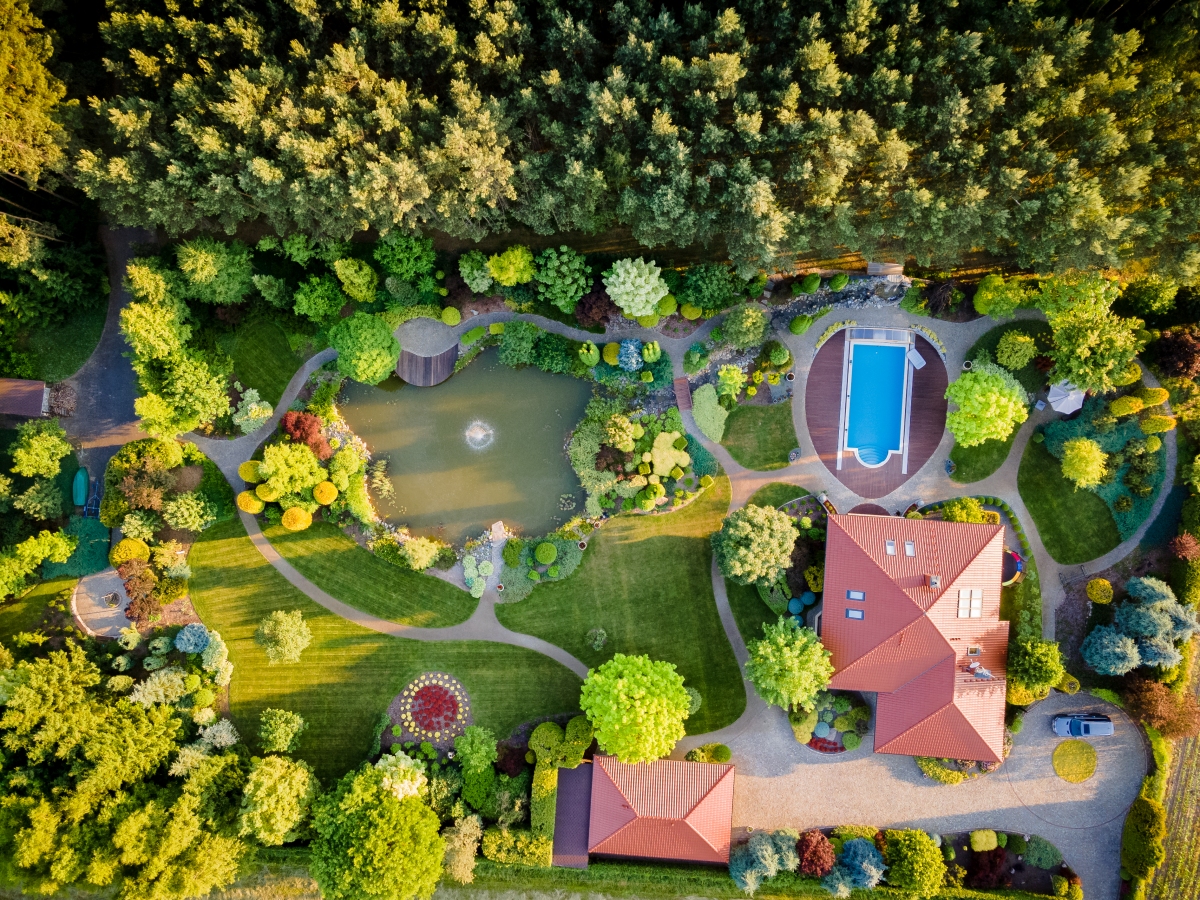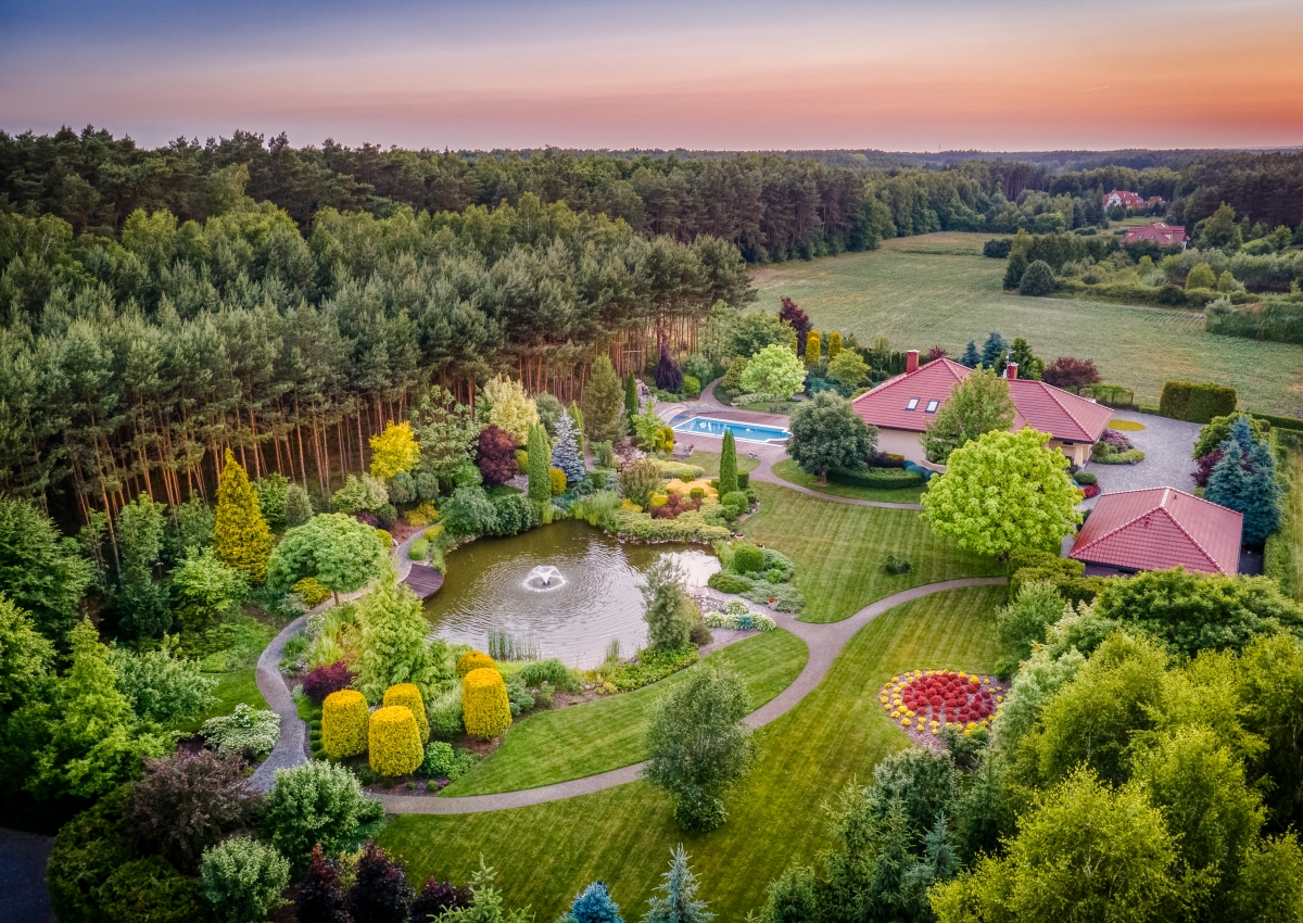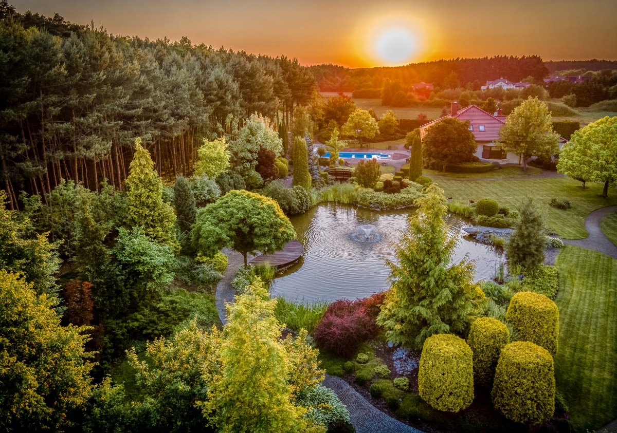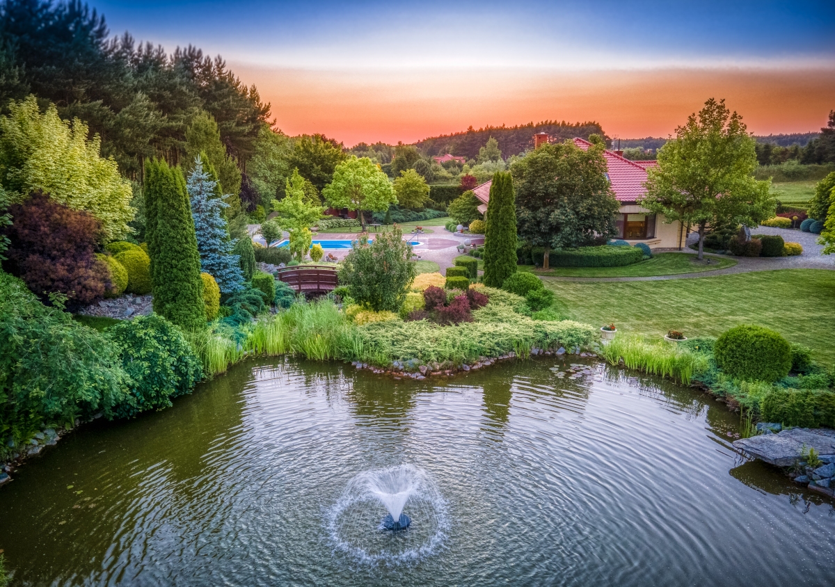 Zautomatyzowany system podlewania, duże oczko wodne 500m², fontanna, most, wodospad, miejscem na ognisko, niezliczona ilość nasadzeń to tylko niektóre z przesłanek charakteryzujących tą przestrzeń.