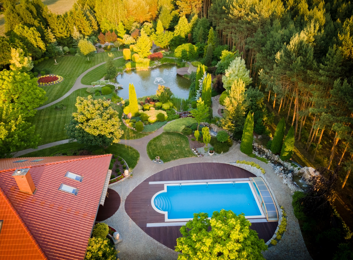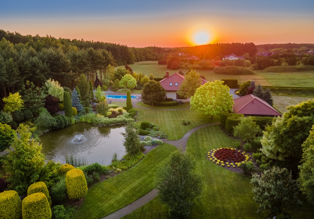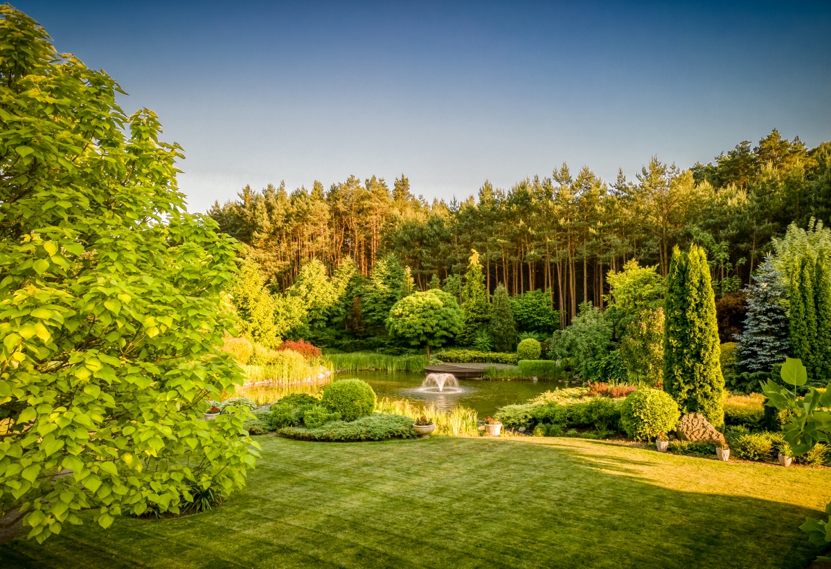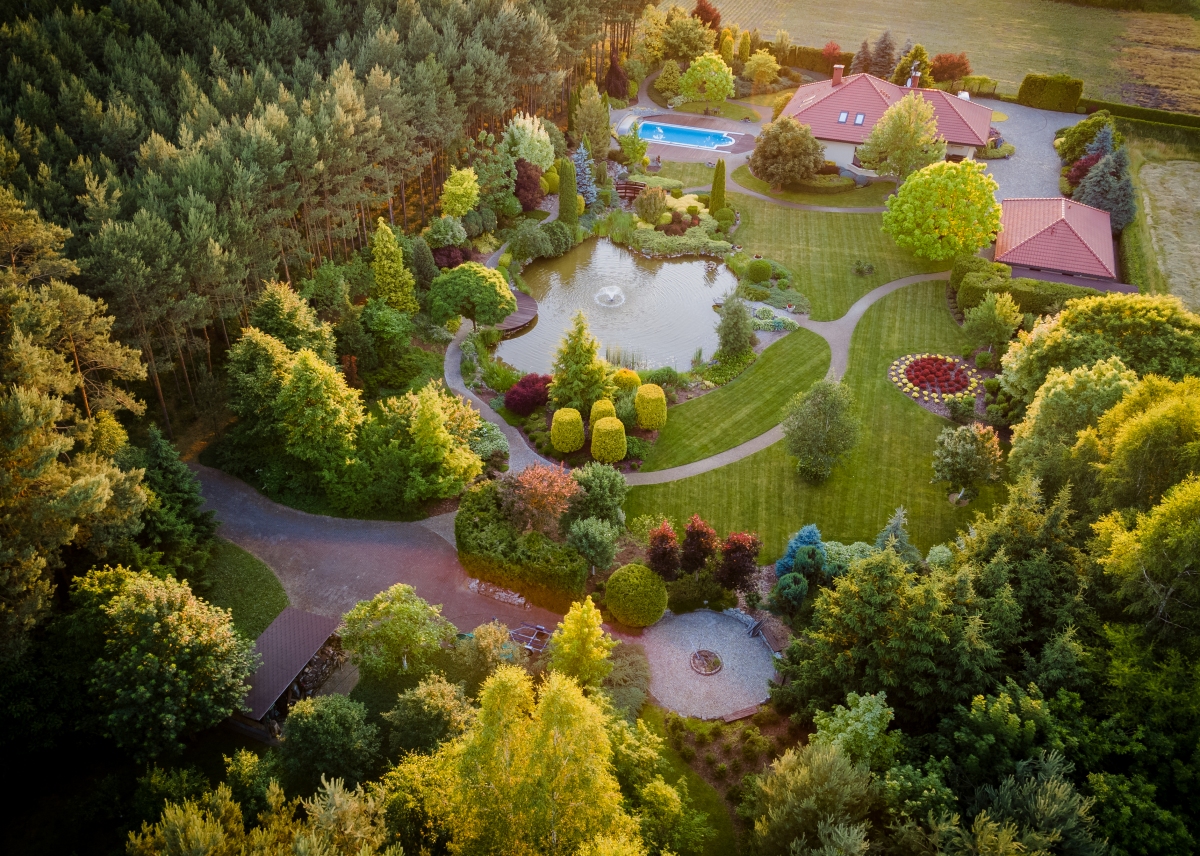 Zautomatyzowany system podlewania, duże oczko wodne 500m², fontanna, most, wodospad, miejscem na ognisko, niezliczona ilość nasadzeń to tylko niektóre z przesłanek charakteryzujących tą przestrzeń.