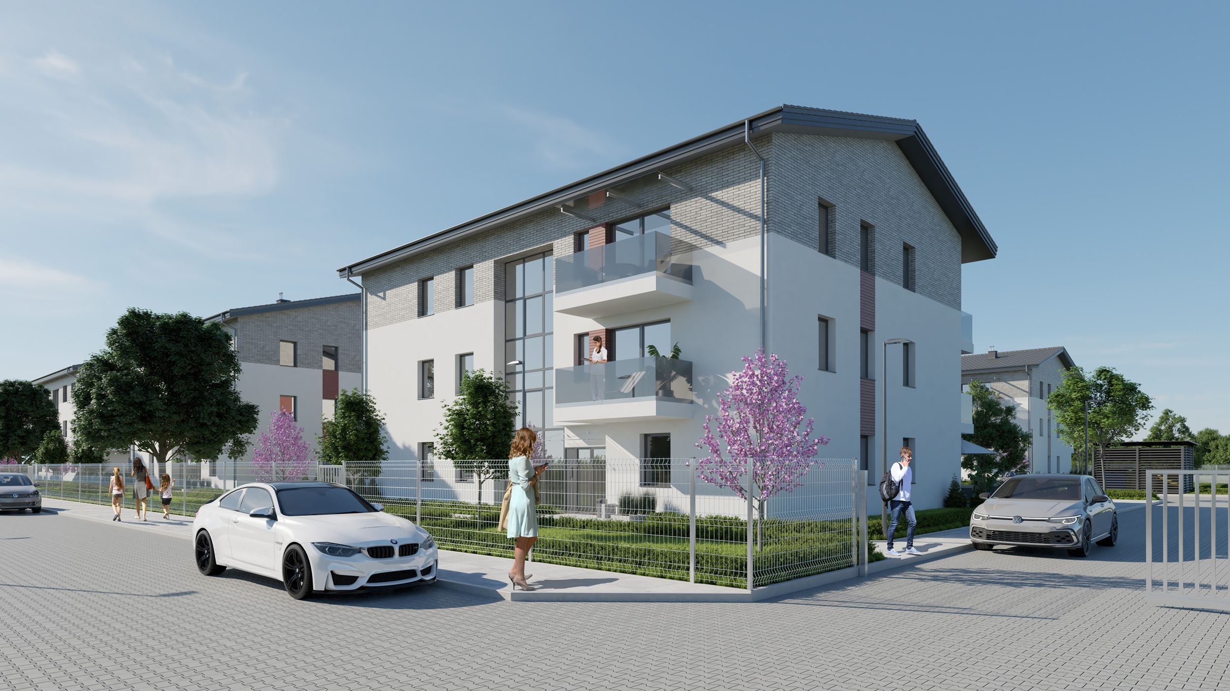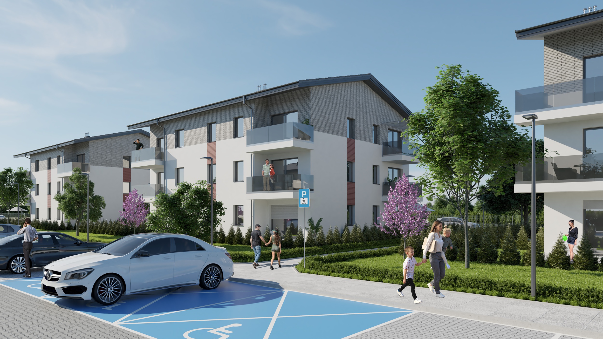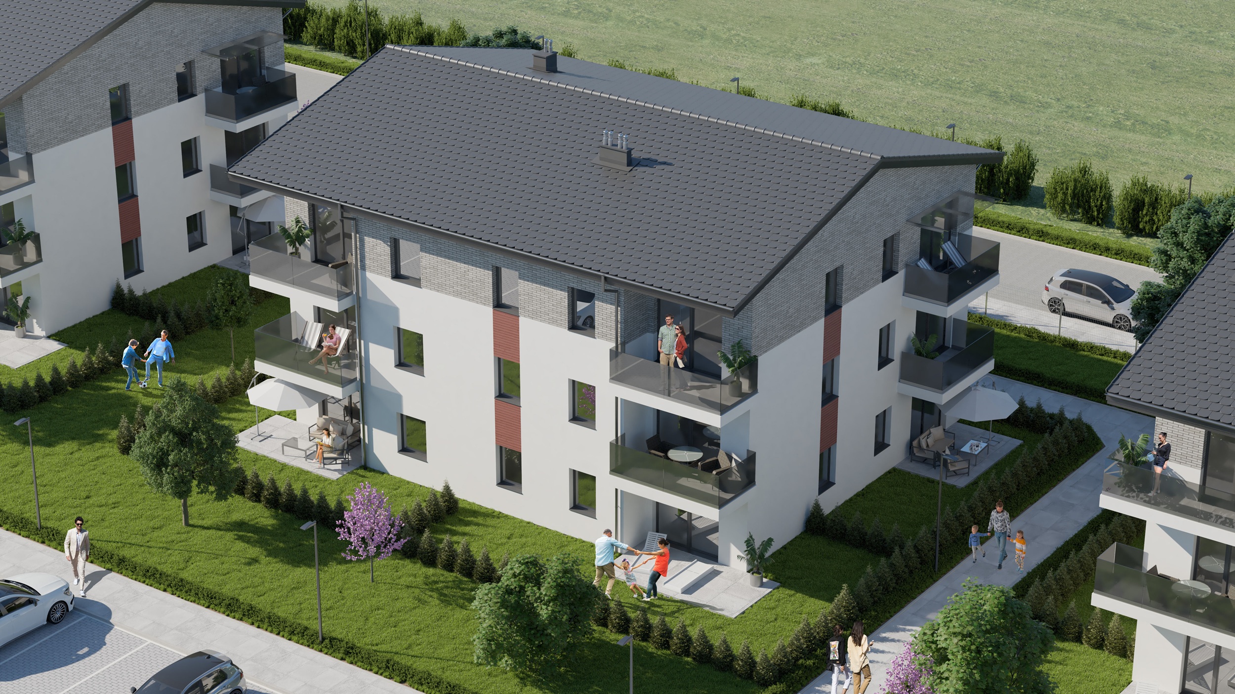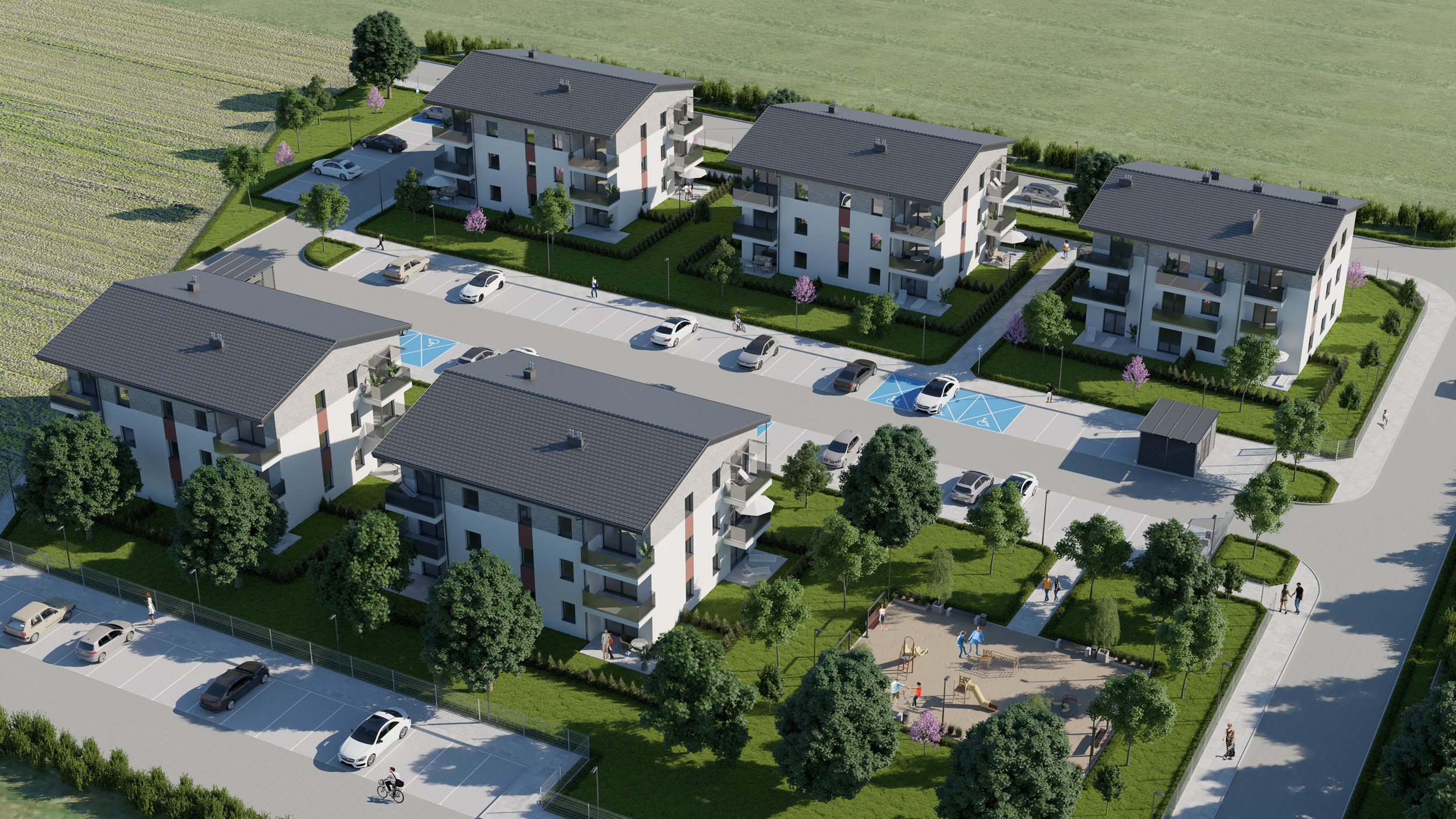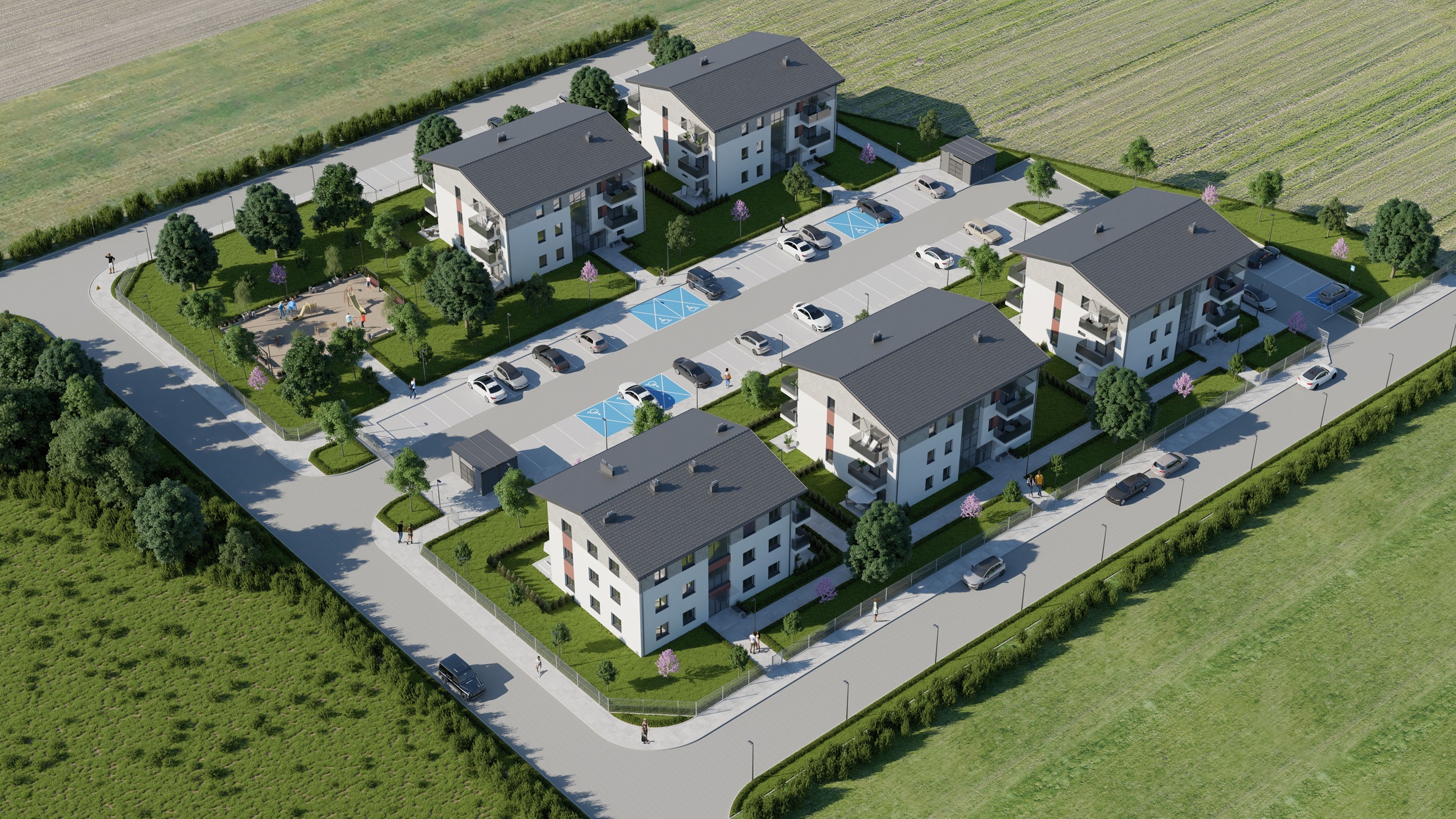 Wiśniowe Osiedle w Czernikowie to docelowo zespół 5 budynków wielorodzinnych, zlokalizowany na obrzeżach miejscowości – w spokojnym otoczeniu, blisko terenów zielonych, a jednocześnie około 1 km od centrum.