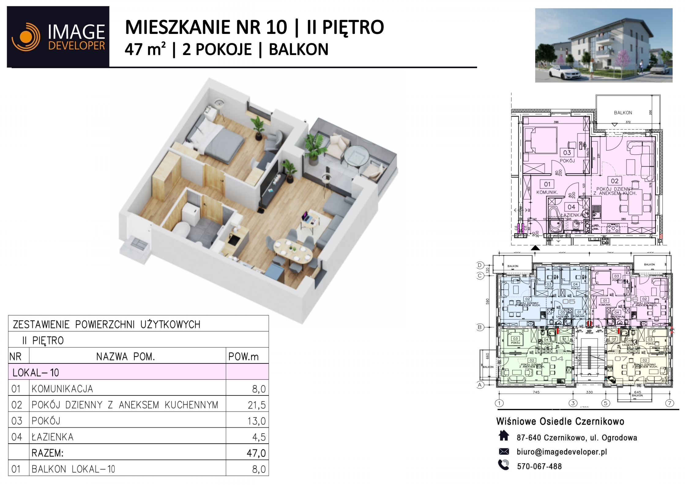 Na sprzedaż funkcjonalne mieszkanie o powierzchni 47 m², zlokalizowane na II piętrze nowoczesnego budynku w ramach inwestycji Wiśniowe Osiedle w Czernikowie (ul. Ogrodowa).